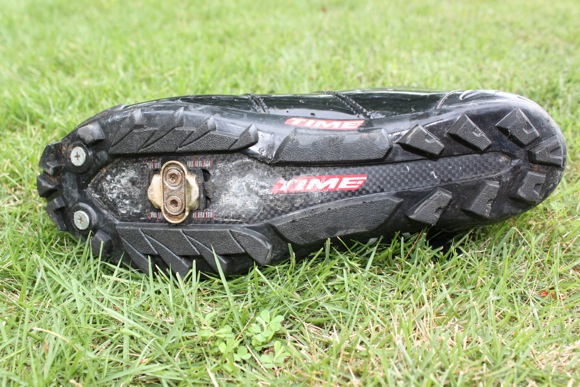 Shown above is the standard “clipless” peddle and its associated shoe wear, the cleat.  These provide a stable platform for long bike rides.  While you are attached to the bike peddle, a small twist of the ankle quickly slips you from the peddle, a very easy release.