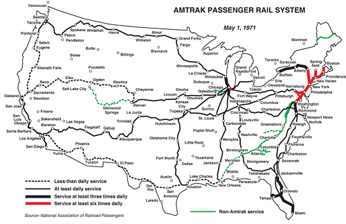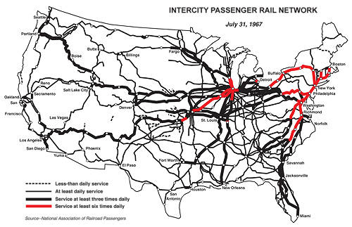 The pictures below show the extent of passenger rail service in 1962, 1967 and then a picture of the Amtrak system at its birth and finally a map of today’s system. Even a cursory look at the earlier maps shows a much more robust passenger rail system.